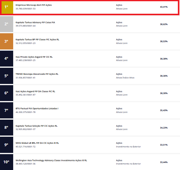 E o fundo não se destaca somente em relação ao benchmark, como também à toda a indústria. Em um levantamento dos últimos seis meses, o Empiricus Microcap Alert ficou em 1º lugar no top 10 fundos de ações da Mais Retorno: