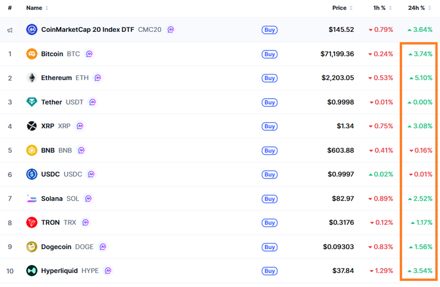 Na noite de terça-feira (7), após os Estados Unidos anunciarem um cessar-fogo de duas semanas, os principais criptoativos registraram alta. Esse movimento pode ser observado na coluna à direita da imagem abaixo, da tarde de quarta-feira (8):