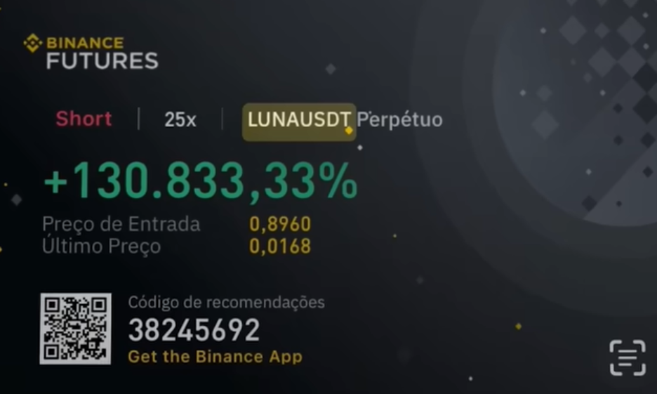 Ao acionar sua lista de contatos, ele descobriu que um dos grandes vendedores era a Binance, a maior corretora de criptomoedas do mundo. “Meu sinal de alerta foi acionado e eu avisei para minha comunidade entrar vendido em Luna”, explica.