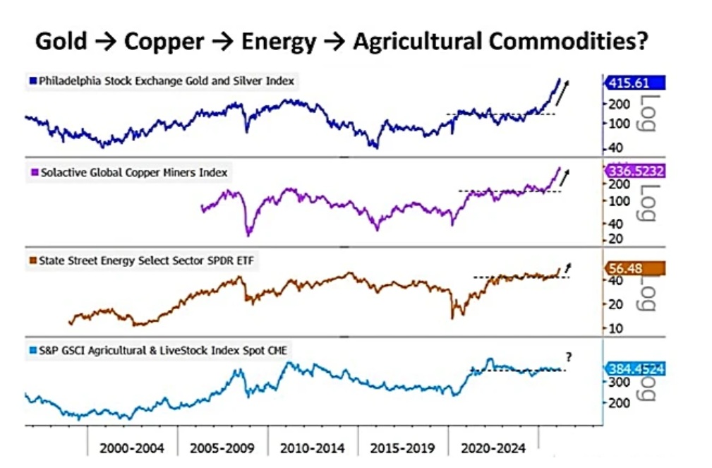 O analista reforça sua leitura: o rali atual não caracteriza um fenômeno isolado, mas faz parte de um ciclo de valorização das commodities em que diferentes classes de ativos avançam uma após a outra.