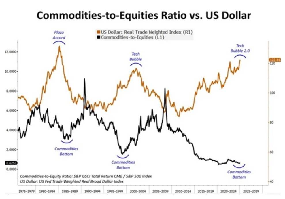 Abaixo, é possível ver a evolução do dólar entre 1975 e 2025 na comparação com outras moedas. Esse dado aparece na linha laranja. Junto a ele, a progressão de um índice que compara os preços das commodities diante de ações dos EUA é mostrado em preto.