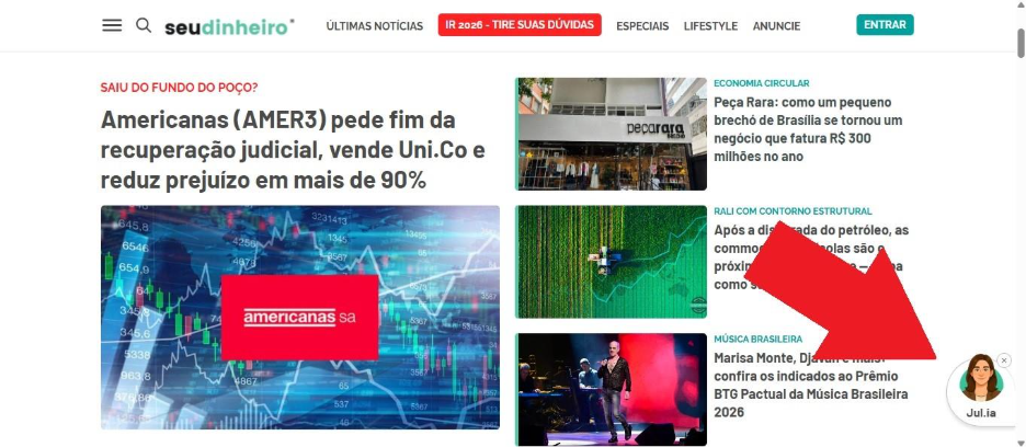 Para encontrá-la, basta clicar aqui ou abrir a página inicial do site do Seu Dinheiro – você verá a carinha da Jul.ia no canto inferior direito da tela: