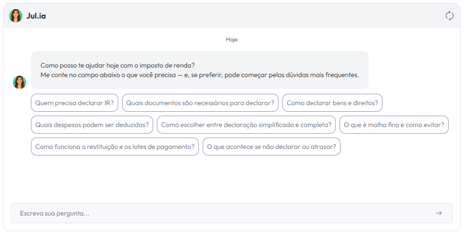 Trata-se da Jul.ia, uma assistente virtual que responde suas dúvidas sobre Imposto de Renda em instantes.