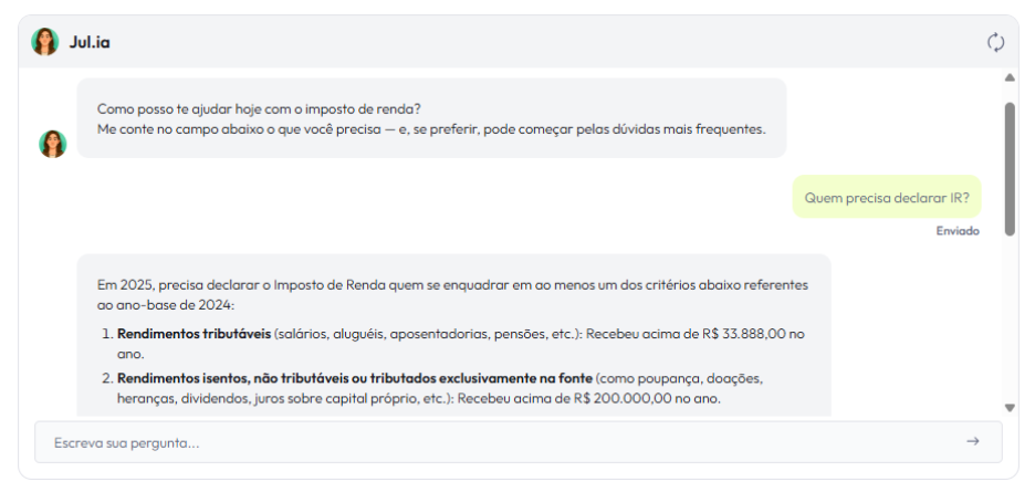 Com a nossa assistente virtual você tira todas as suas dúvidas sobre Imposto de Renda em poucos segundos.
